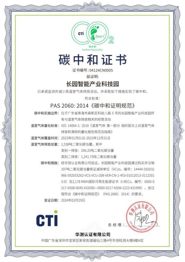 近日,555000jcjc公海科技集团位于珠海高新区的“555000jcjc公海智能产业科技园”完成了2023年度运营层面的碳中和认证工作,这一重要成就标志着该园区已连续两年实现碳中和目标。